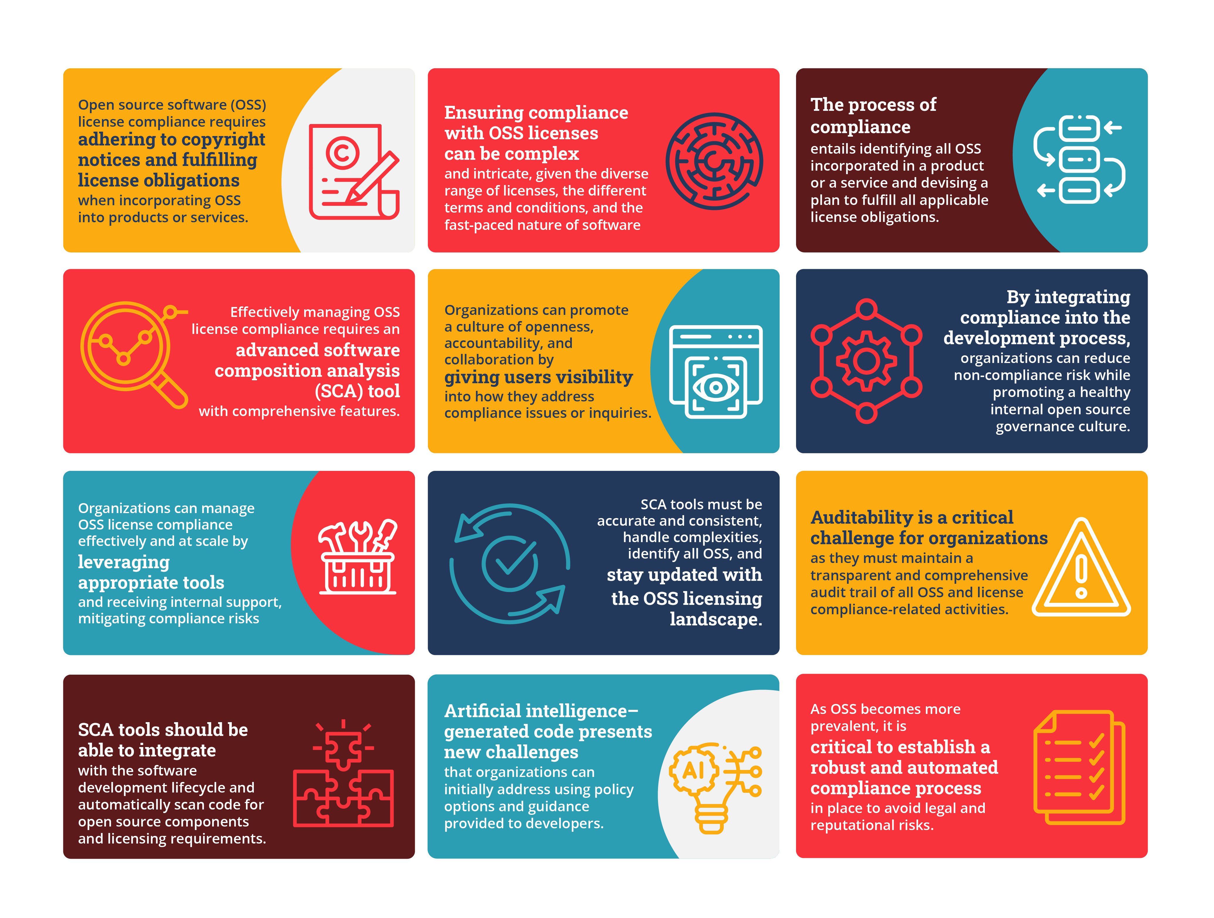 Download ReportThe widespread adoption of open source software rests on compliance with the licensing requirements of those components. Keeping up-to-date in the rapidly evolving software and licensing landscape makes this challenging, made more difficult by the diversity of licenses and the ways that their terms and conditions can vary. This paper delves into these challenges and strategies for effectively implementing compliance, acting as a tool for organizations to mitigate any associated risks and to ensure continued benefit in their open source participation. From comprehensive software composition analysis tools to promoting the right development culture, read more about how to effectively address these challenges in the full report!